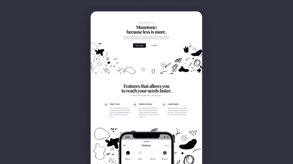 Monotone is a HTML template built using Tailwind CSS. It features a modern and elegant design by Wicked Templates